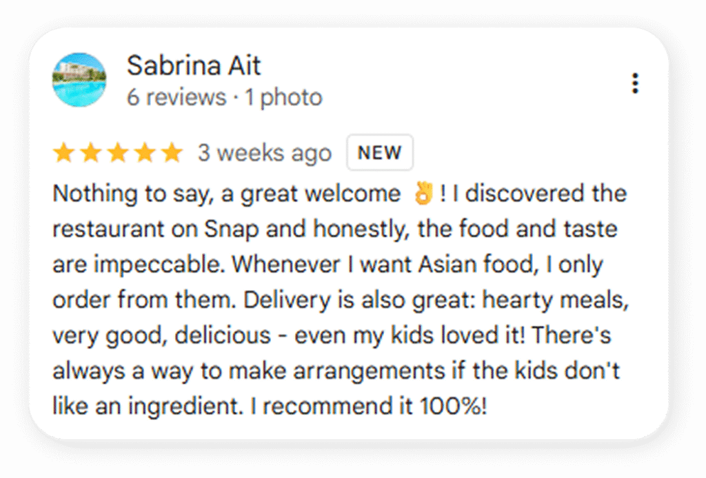 Rien à dire, accueil au top 👌 ! J’ai découvert le restaurant sur Snap et franchement, la cuisine et le goût sont irréprochables. Dès que j’ai envie de manger asiatique, je commande uniquement chez eux. En livraison aussi, c’est au top : repas copieux, très bons, délicieux — même mes enfants ont adoré ! Il y a toujours une possibilité de s’arranger quand un ingrédient ne plaît pas aux enfants. Je recommande à 100 % !