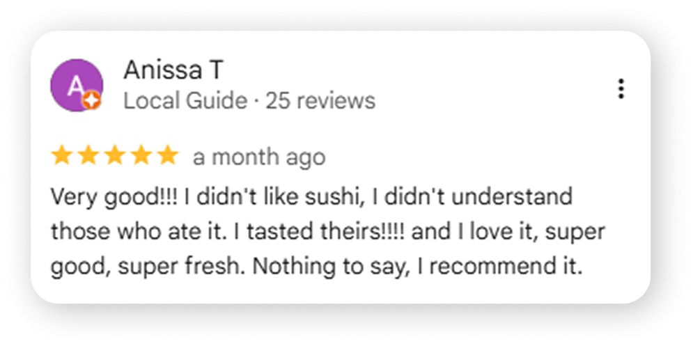 Je ne suis jamais déçue ! C’est une enseigne qui ne cesse d’évoluer. Je vous la conseille les yeux fermés. C’est les meilleurs sushis de la ville !